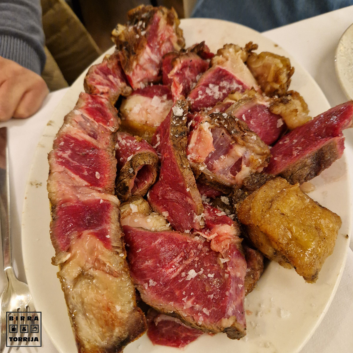 1.9Kg, de nuevo sin presentar la pieza. Acto de fe. Sale ya trinchada, levemente marcada y para acabar en la plancha con quemador. Trozos gordos. Bastante buena. La guarnición… ay la guarnición: