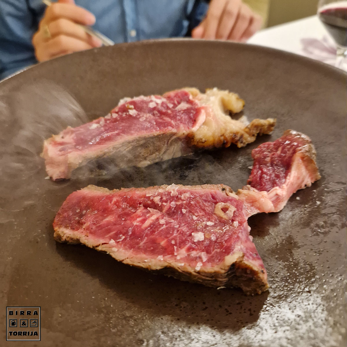 —Entrantes, rodaballo y chuletón.