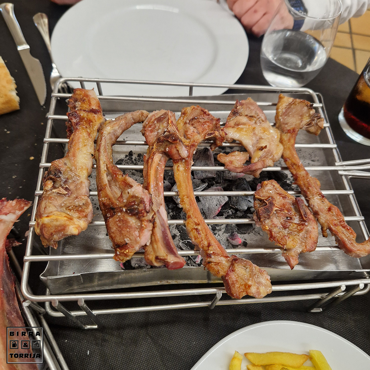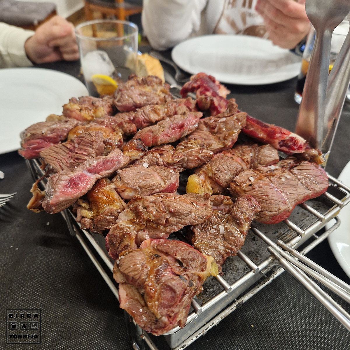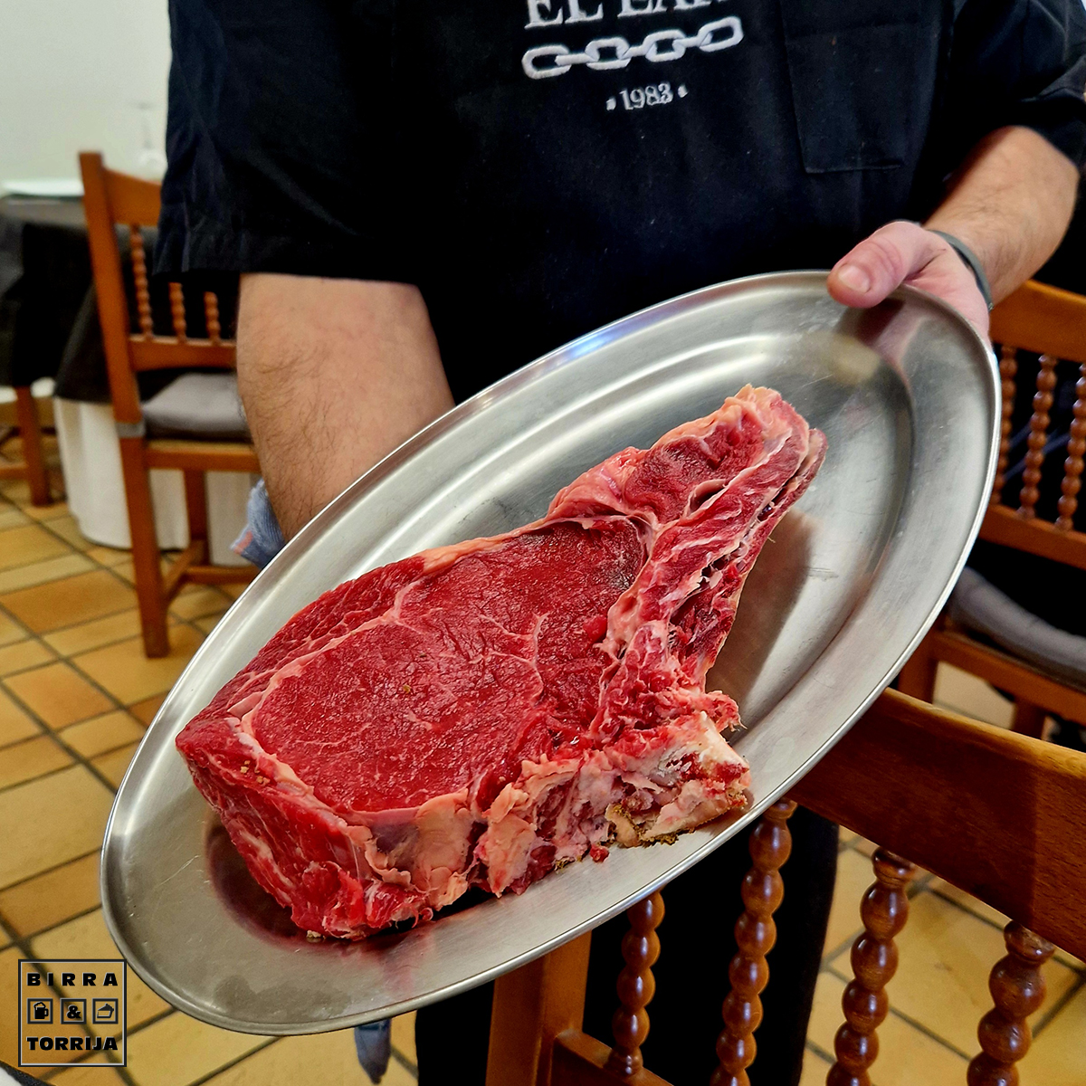 Cortado con hacha desde el chuletero en nuestra presencia… si, hacha. Presentado a los comensales y a las ascuas. Buen tamaño si señor. Carne no madurada, apta para todos los públicos. En mesa con algo de brasa en parrilla para mantener aunque tb sobrecocinar peligrosamente si te dormías en los laureles… bien bien