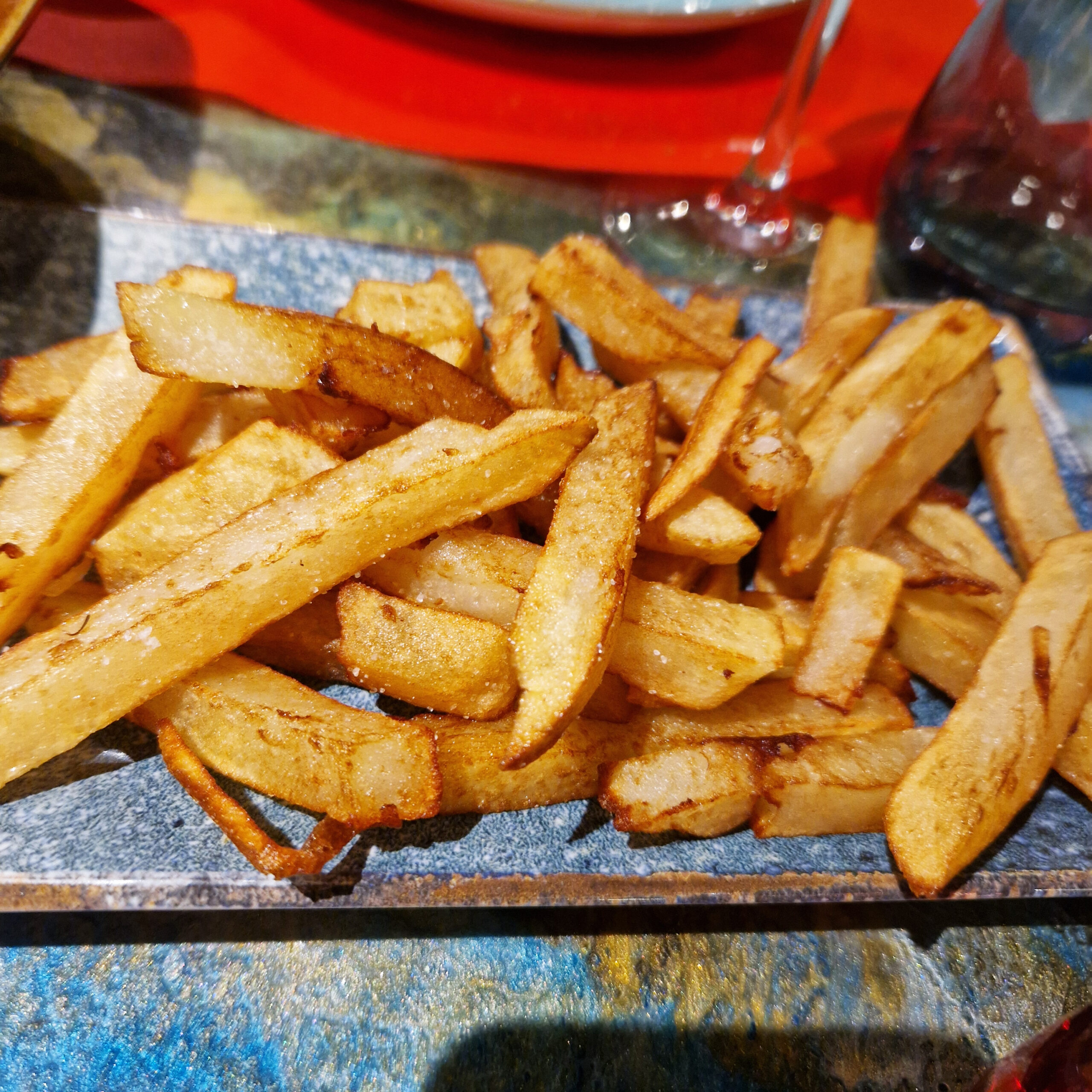 No preguntaron el punto, tampoco lo dijimos, y salió algo más hecho de lo que hubiera preferido pero era salvable. Venía ya trinchado sobre una piedra caliente. Calidad media, algo graso, se dejaba comer. Las patatas muy muy ricas y sin cobrártelas aparte como en otros sitios.
