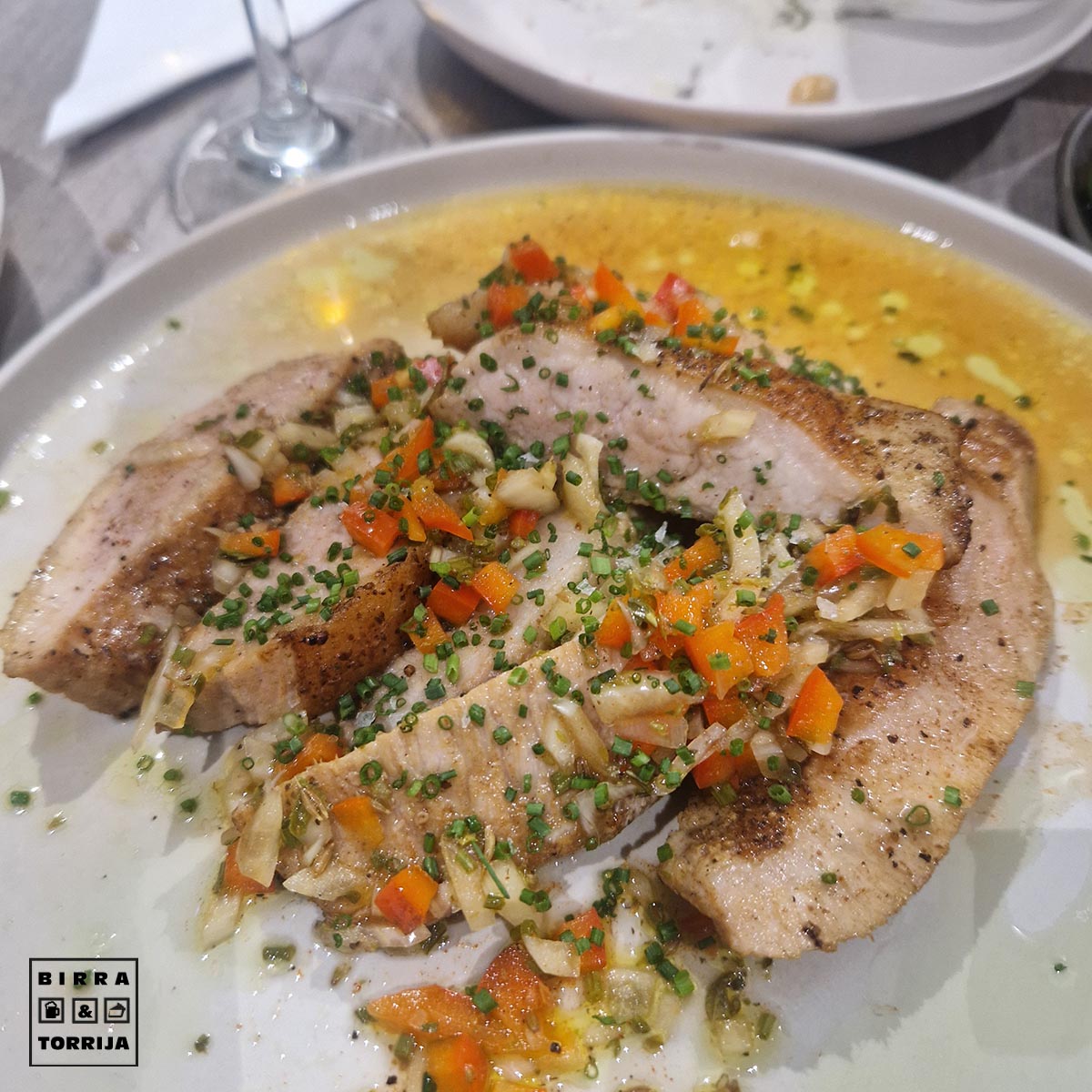 Muy tierno y con un majado que le daba un toque guay, Acompañaban patatas qu casi ni tocamos peeero… llevaban algún pimiento extra.