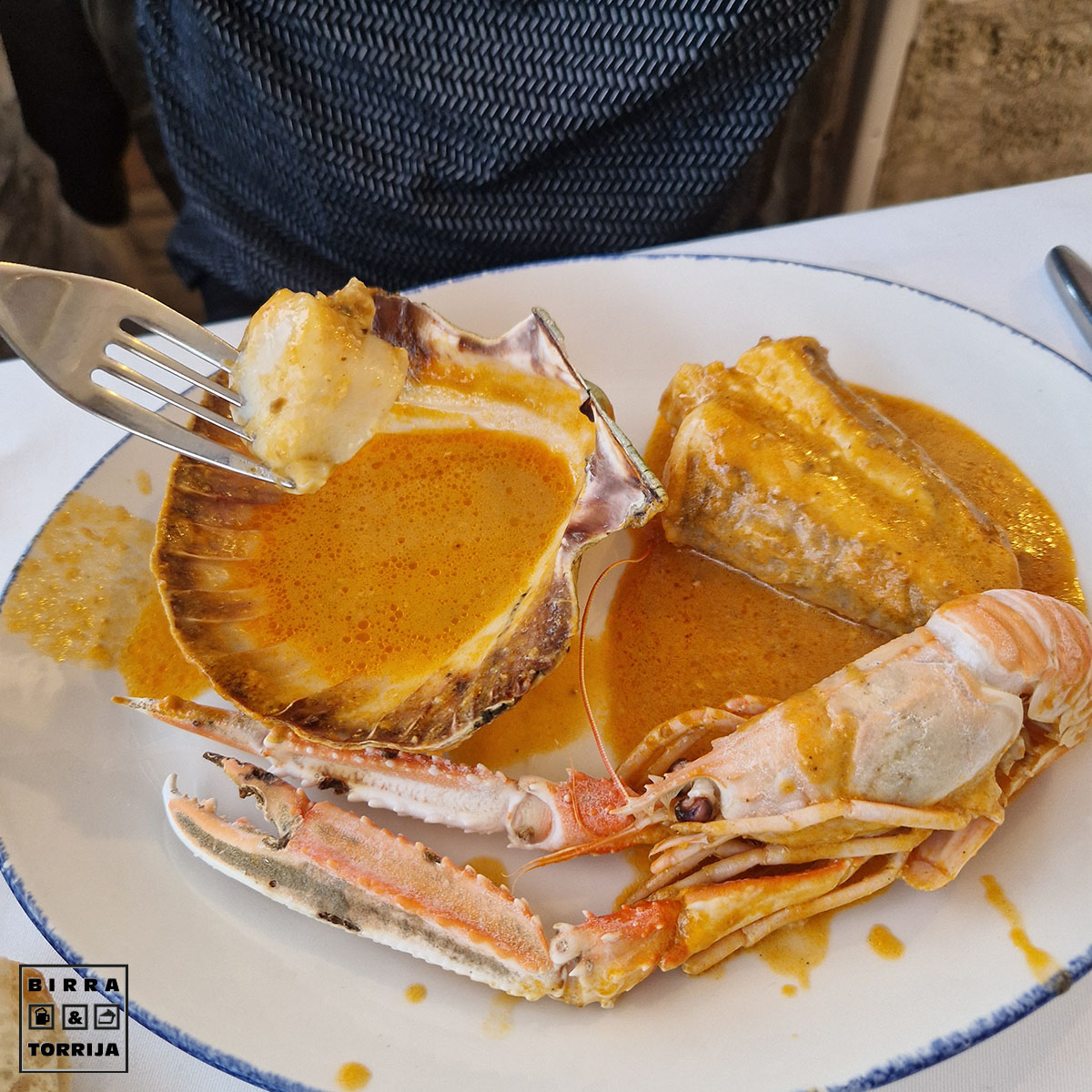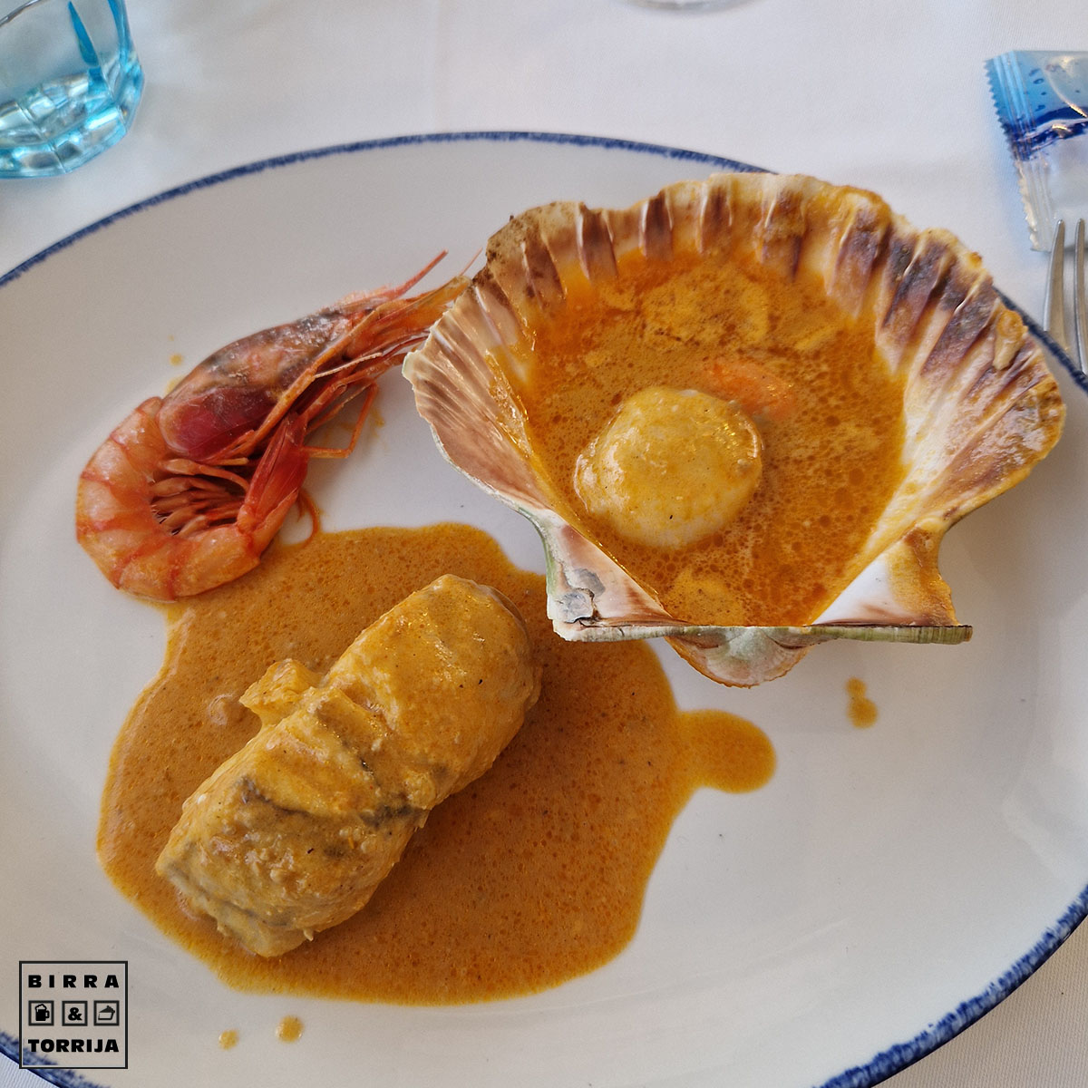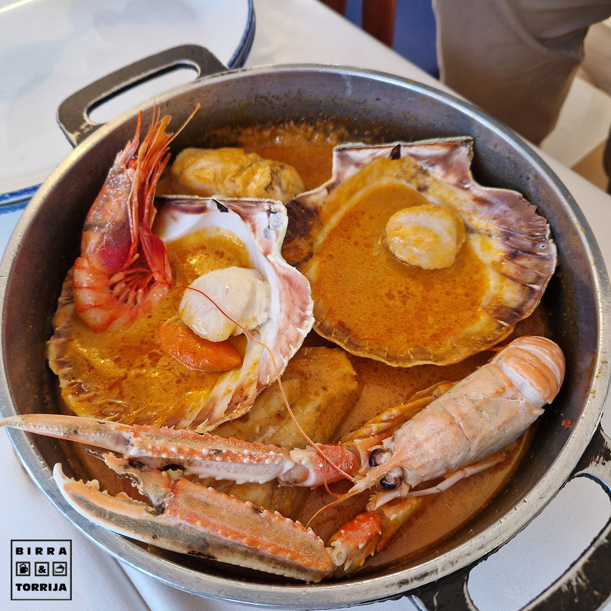 Rape, gamba roja, cigala y vieira… Todo de primera división… pero el caldo… EL CALDO !. Eso no era fumé, era nectar de los dioses, sopa de Valhalla, pis de unicornio. Hasta un bloque de tofu sería un platazo en ese fondo. Usando la concha de la vieira y algo de pan dejamos el perolo reluciente.